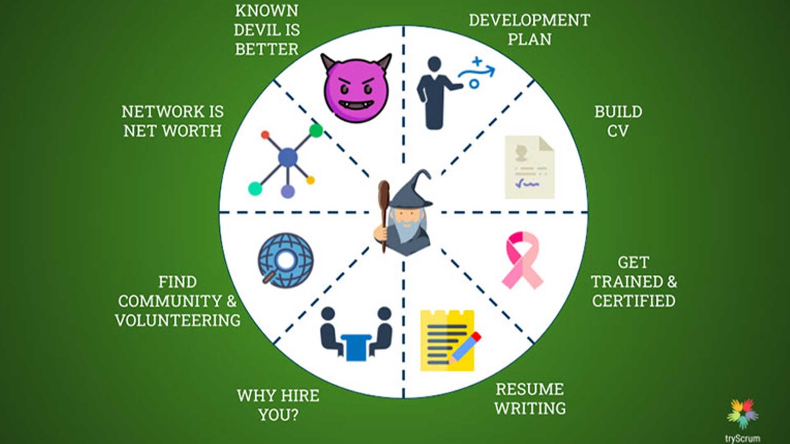 For example, after a couple of years, you would like to start your career as a Scrum Master, helping your Organization radically re-imagine the kind of work done.